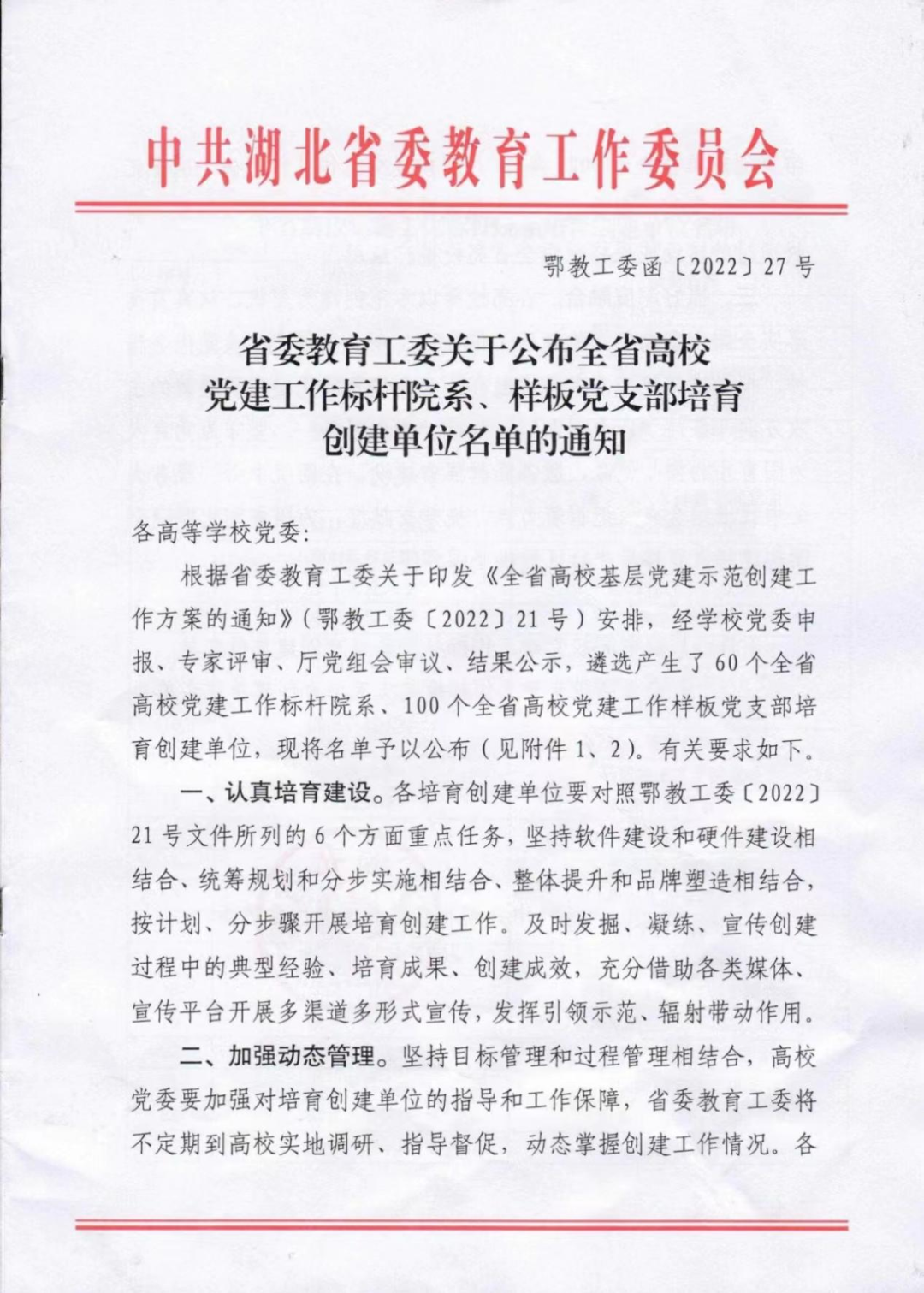 近日,湖北省委教育工委公布了全省高校基层党建示范创建名单,共遴选产生60个院系党组织、100个党支部分别作为全省高公司党建工作标杆院系、样板支部培育创建单位。公司党总支部入选“全省高公司党建工作标杆院系”培育创建单位。
