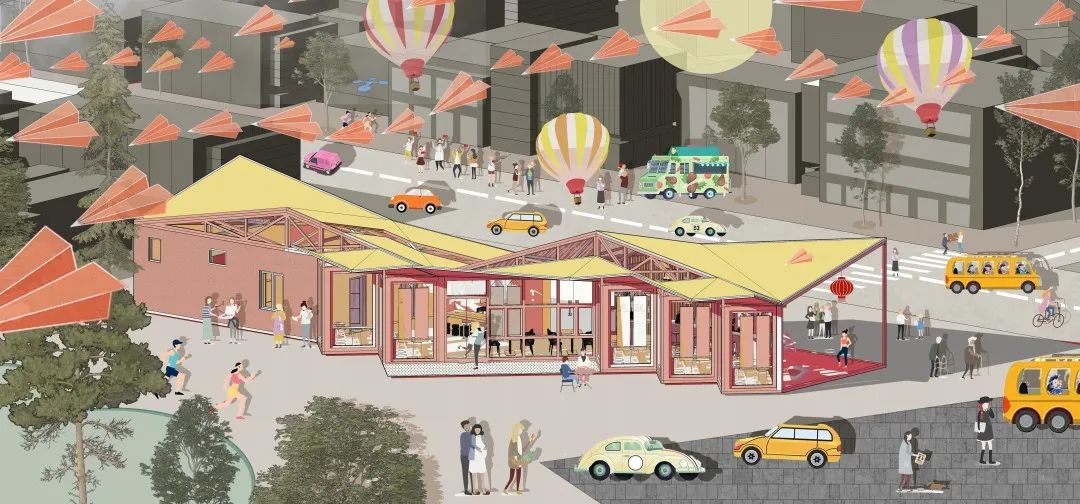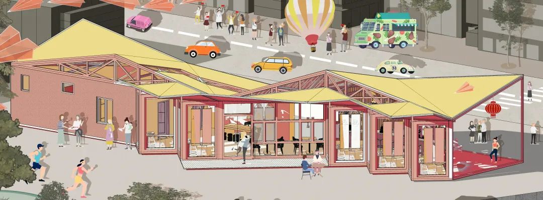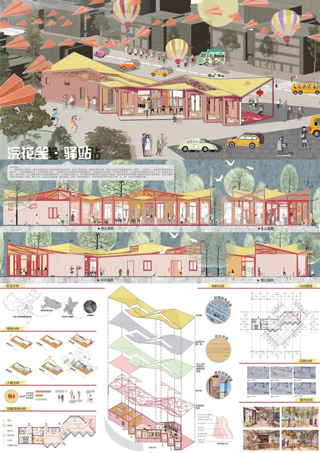 “该驿站设计灵感之一,是源于与项目地址纸金路相邻的纸坊街。武汉江夏纸坊街,盛唐时佛寺云集,周边以造纸作坊聚集而得名“纸坊”,沿用至今。故该驿站屋顶造型为折纸状,“浣花牋纸桃花色,好好题诗咏玉钩”,这是唐代诗人李商隐吟咏彩笺的名句,故该驿站以此相称。浣花笺纸传古韵,江夏纸坊又将造纸术传承了下去。驿站设计灵感之二源于折扇,文人墨客在扇子上用笔墨寄情抒怀,以诗画予折扇之上;而江夏的山湖美景将以此驿站为载体,通过折扇状的玻璃窗从更多的角度来观赏美景,极目江夏的山湖之景!”