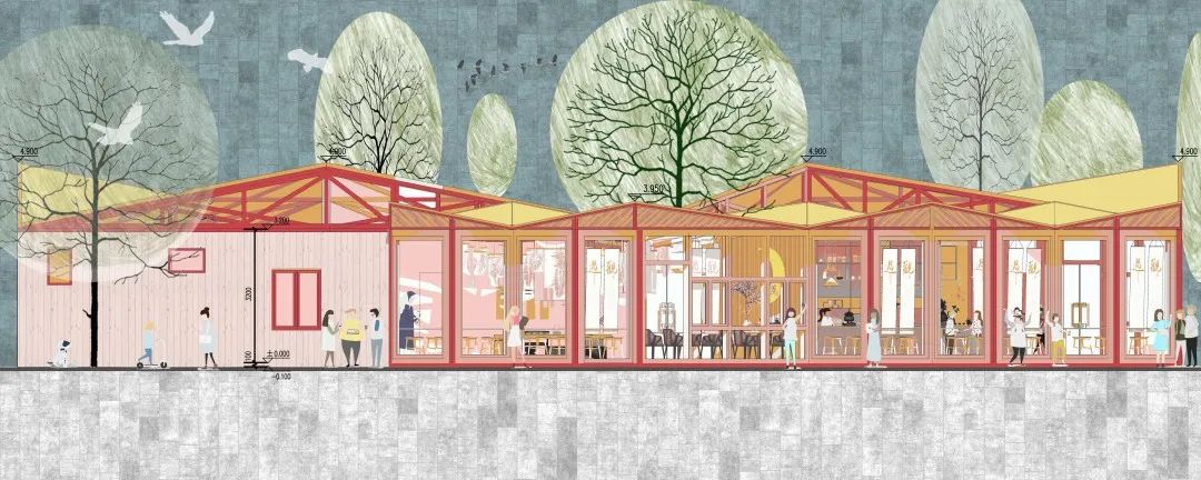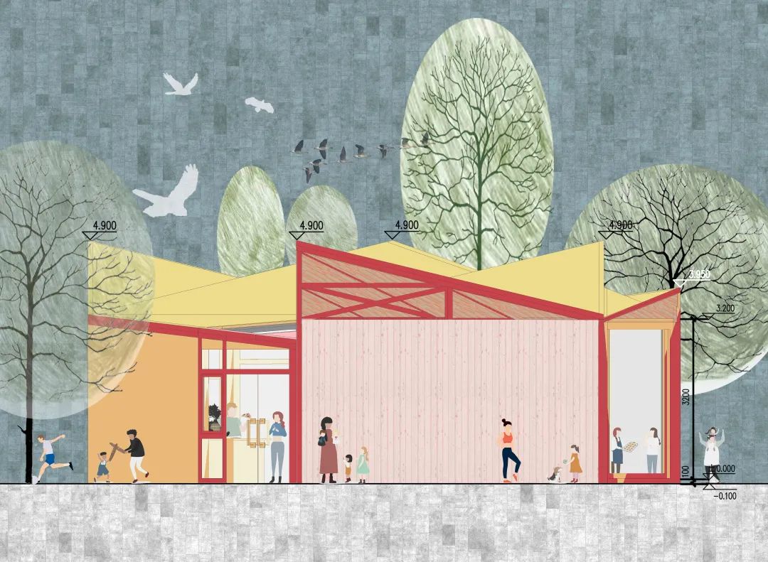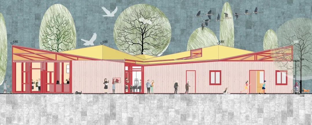 最后,关于作品的细节,陈思雅、有静怡两位同学是这样阐述的:“该设计借自然之景,展山湖之韵,营生态之道,打造江夏诗风画韵风景道。驿站兼顾公园管理和游客休憩功能。建筑总面积170平方米,总高度不超过5米,外立面采用大面积多角度通透玻璃,可将外部景色引入室内,为游客提供观山关湖的休闲体验。功能空间设计采用公共空间和半公共空间结合,体现了人性化的服务;灯光的设计以暖光为主,与自然光结合营造出一种温馨的氛围,打造归属感。整体建筑很少使用合成材料,屋顶开有天窗能充分利用阳光,节省能源,也为游客们创造出一种接近自然的感觉。我们的设计以人、建筑和自然环境的协调发展为目标,在利用天然条件和人工手段创造良好、健康的环境的同时,尽可能地控制和减少对自然环境的使用和破坏,充分体现向大自然的索取和回报之间的平衡和追求生态自然体现健康主题的特色。”