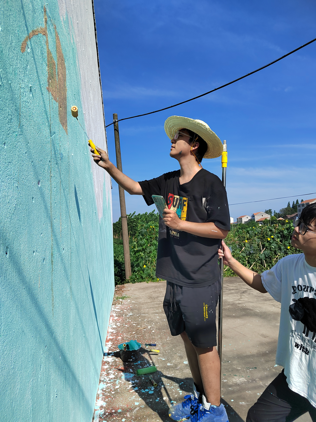 夏日炎炎,骄阳似火。一顶一顶遮阳帽下,是“筑梦”服务队监利分队成员们红彤彤的脸,汗珠顺着他们的脸颊从下巴滚落。自7月3日出发至今已历时一周,队员们每天日照而出,日落而归,时刻秉承着吃苦耐劳的精神。在一周的磨砺下,团队合作能力越来越强,作品完成时间也越来越快。