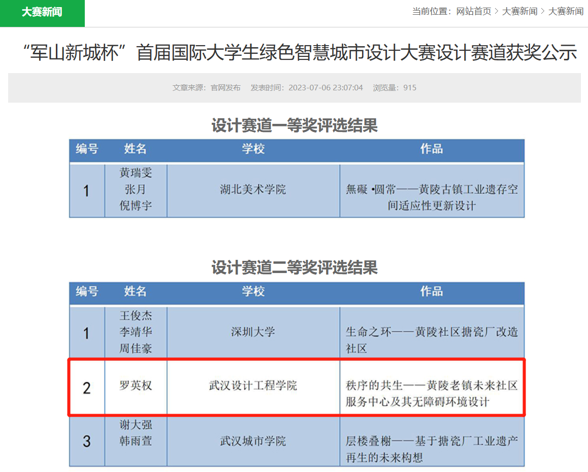 近日,“军山新城杯”首届国际老员工绿色智慧城市设计大赛结果揭晓,公司学子环境设计 2020 级员工罗英权同学的设计作品《秩序的共生——黄陵古镇未来社区服务中心及无障碍环境设计》名列第三,荣获设计赛道二等奖;环境设计2019 级陈思雅同学的设计作品《军山塘瓷厂环境改造一智慧型康养示范中心设计》荣获设计赛道优秀奖。