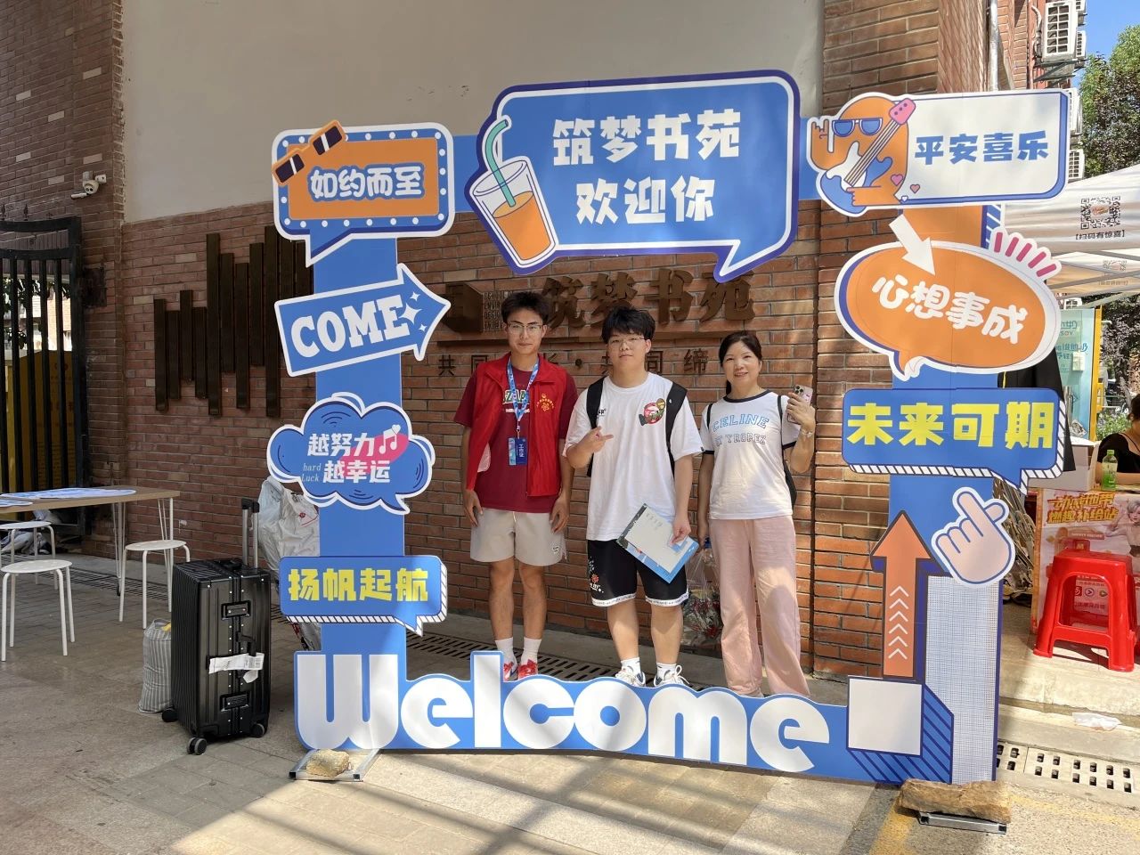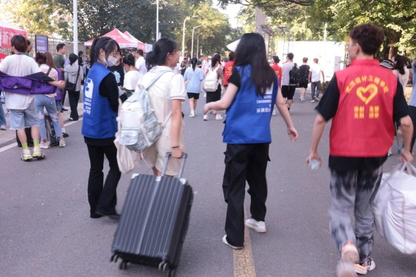 “你好,新同学!”一起打卡拍照吧~定格难忘瞬间!在遮阳棚下、行道路旁、寝室楼里,志愿者们忙碌的身影随处可见,指引方向、帮新生携着行囊、完成报到手续,热情耐心地帮助新同学们。