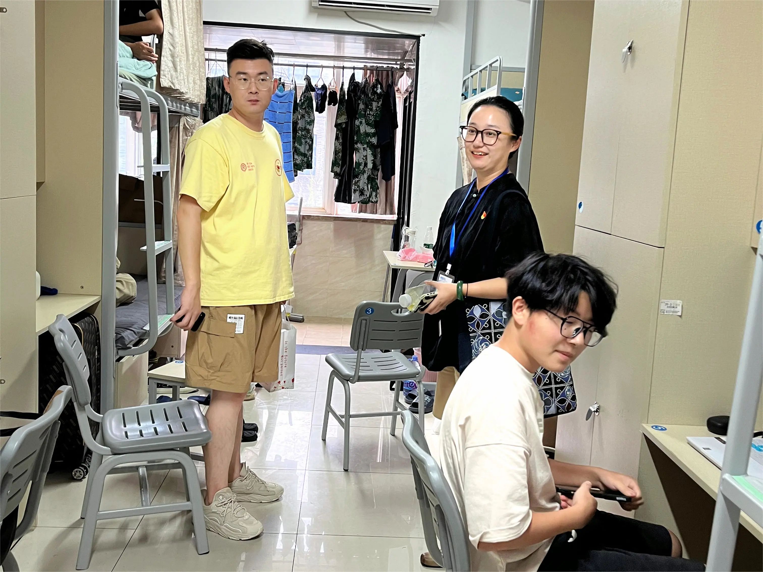 新生们陆续入住宿舍后,公司党总支书记谢曦临带领全体辅导员来访员工宿舍,关心关怀同学们的情况。