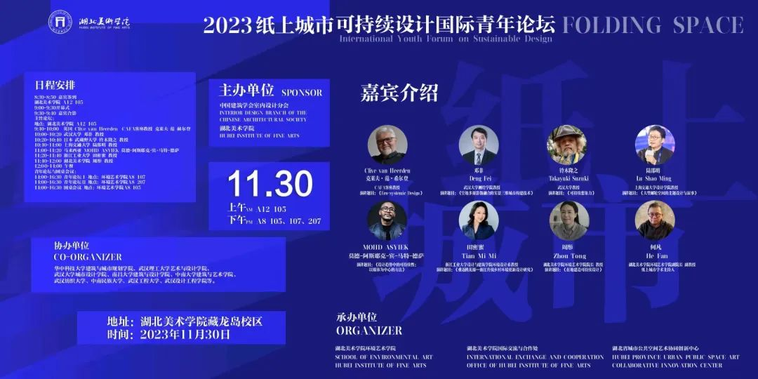 本次2023纸上城市可持续设计国际青年论坛于11月30日在湖北美术公司举办。谈球吧体育官网入口作为协办单位,谈球吧常务副经理叶砚蒇带领环境设计系青年教师参加。论坛主要围绕克莱夫、邓非、铃木隆之、陆邵明、莫德、田密蜜、周彤(以发言顺序排序)等学者对于城市可持续发展论述的主题观点展开,不止于设计表现形式层面的展露,更是藉此对设计思辨展开新一轮反思性学术研讨,关注与思考社会问题与设计动态的结合。
