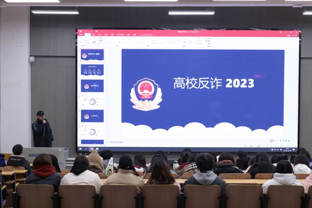 接着,邬壁壑老师通报2023年度我区高校电诈情况,并向我们介绍了典型电诈类型与案例,并介绍了刷单返利、网聊诈骗、假冒好友、游戏交易诈骗,冒充熟人诈骗等常见的诈骗套路及手段。犯罪分子诈骗花样层出不穷,预防高校诈骗需要同学们提高警惕、注意防范。