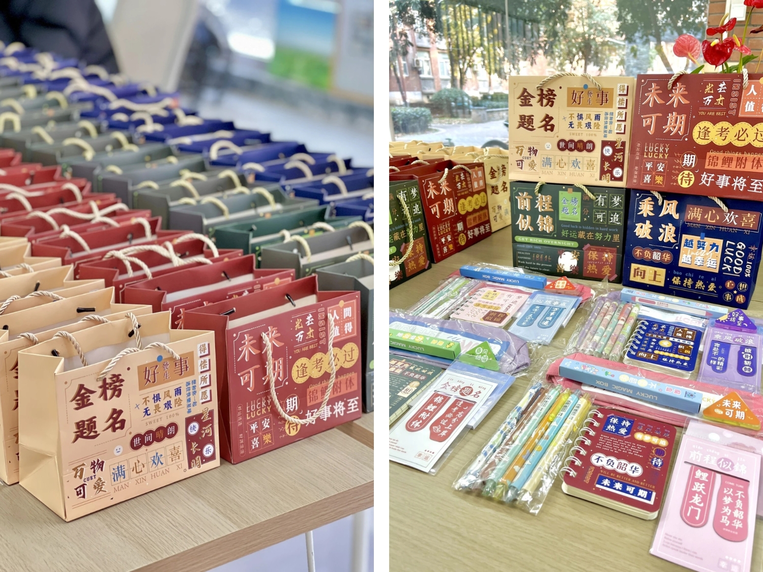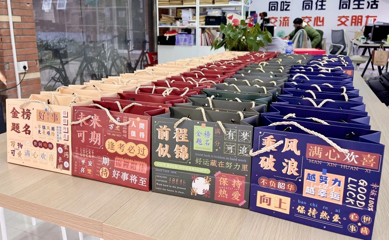 本次的考研助力礼袋上印有“金榜题名”、“前程似锦”、“未来可期”、“乘风破浪”,表达了公司对考研学子们的祝福。礼袋里装的是印有美好寓意和励志语录的文具,处处都充满了对考研学子的鼓励和真挚祝福。