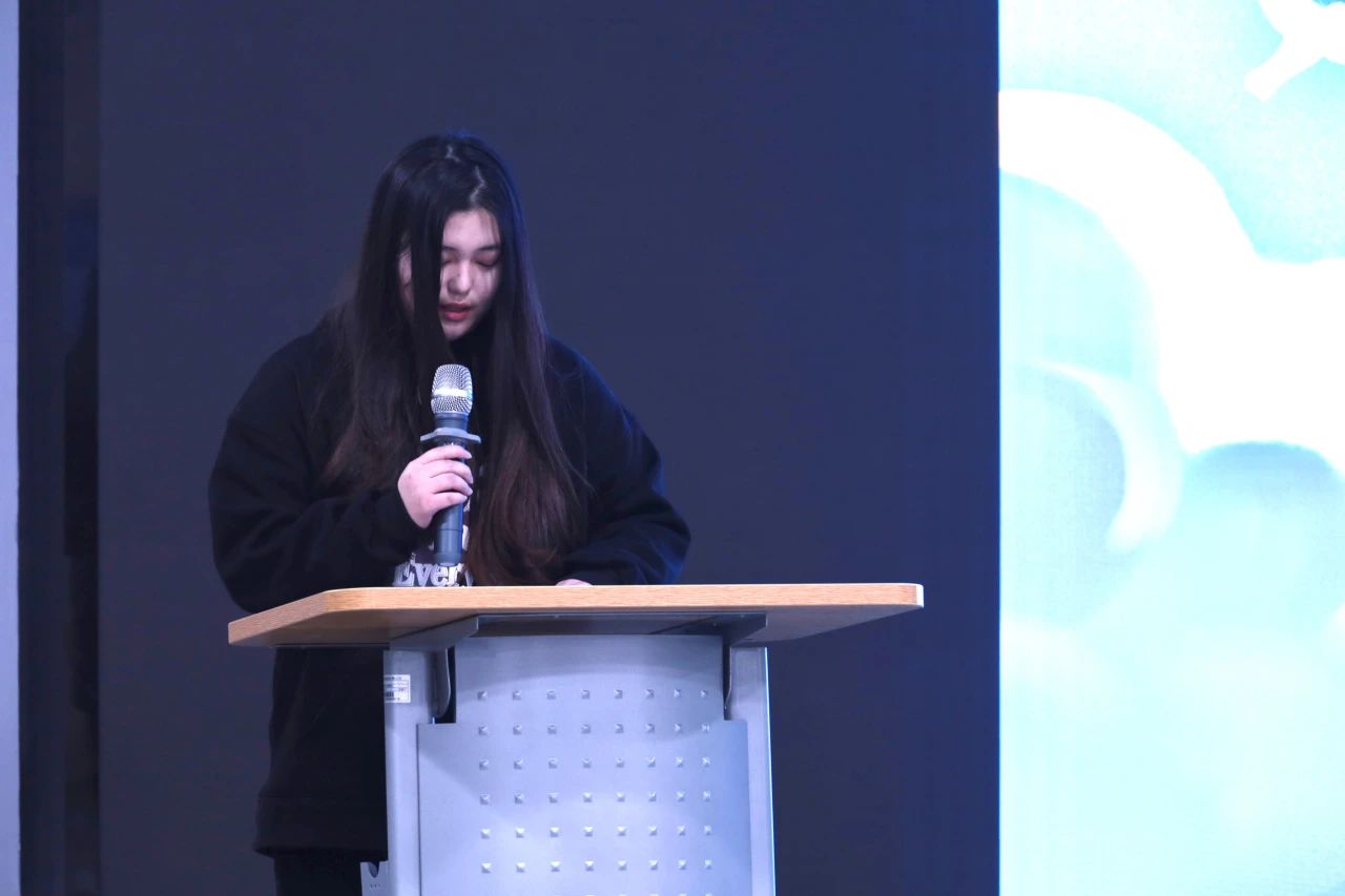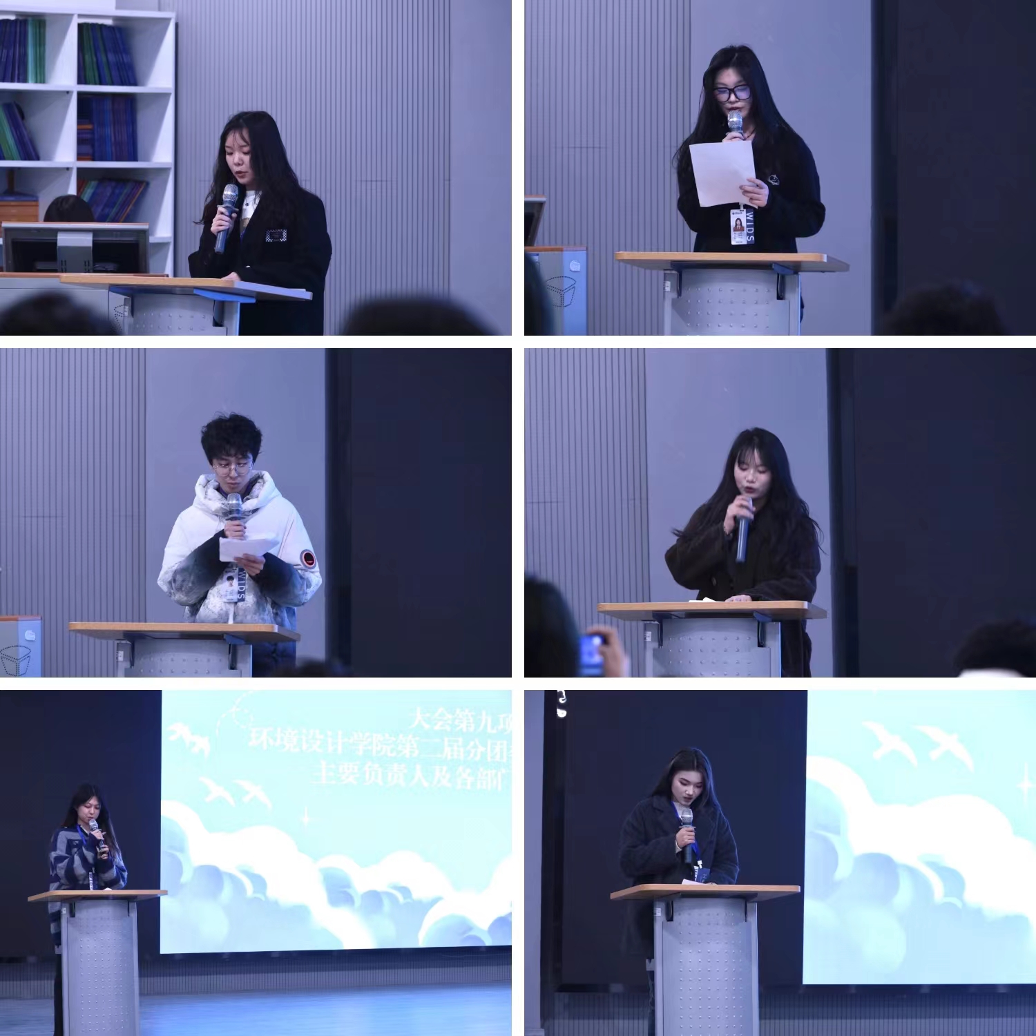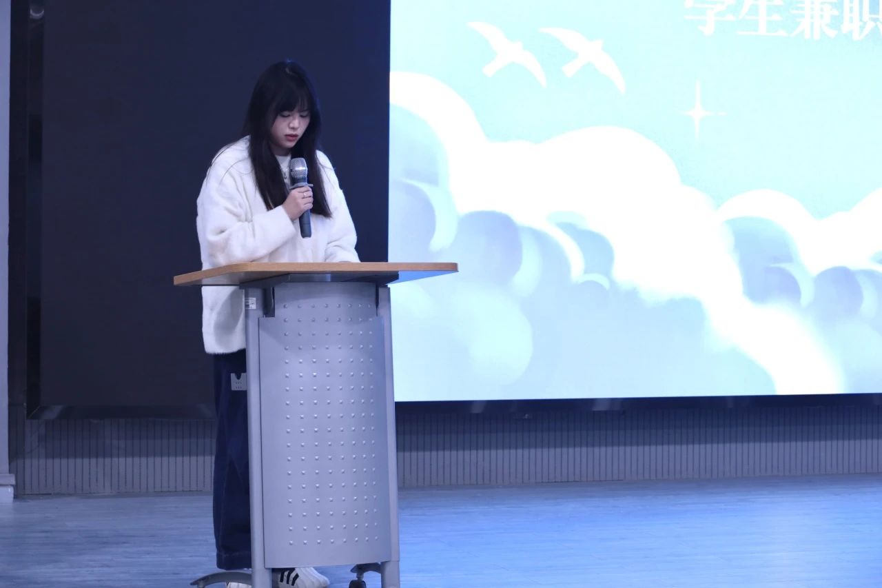 大会第三项,第一届分团委员工会员工代表赵治博同学发言,回顾了过去工作经历获得的成长与领悟同时欢迎新力量的加入。第二节届分团委的李梓萱、秦杰印同学作为员工会新生代表发言,表达了加入员工会组织甘于奉献的初心以及坚守为同学服务的决心。