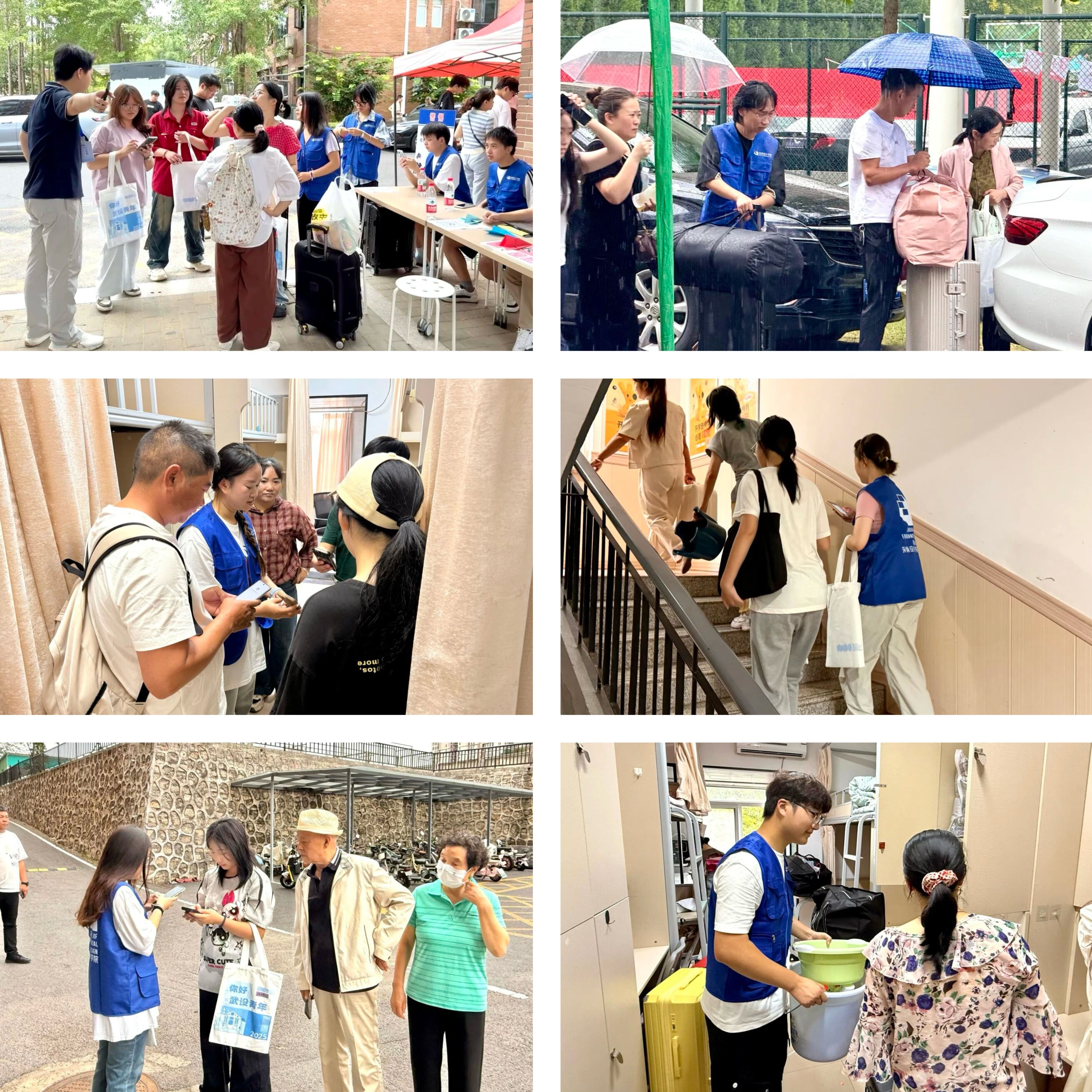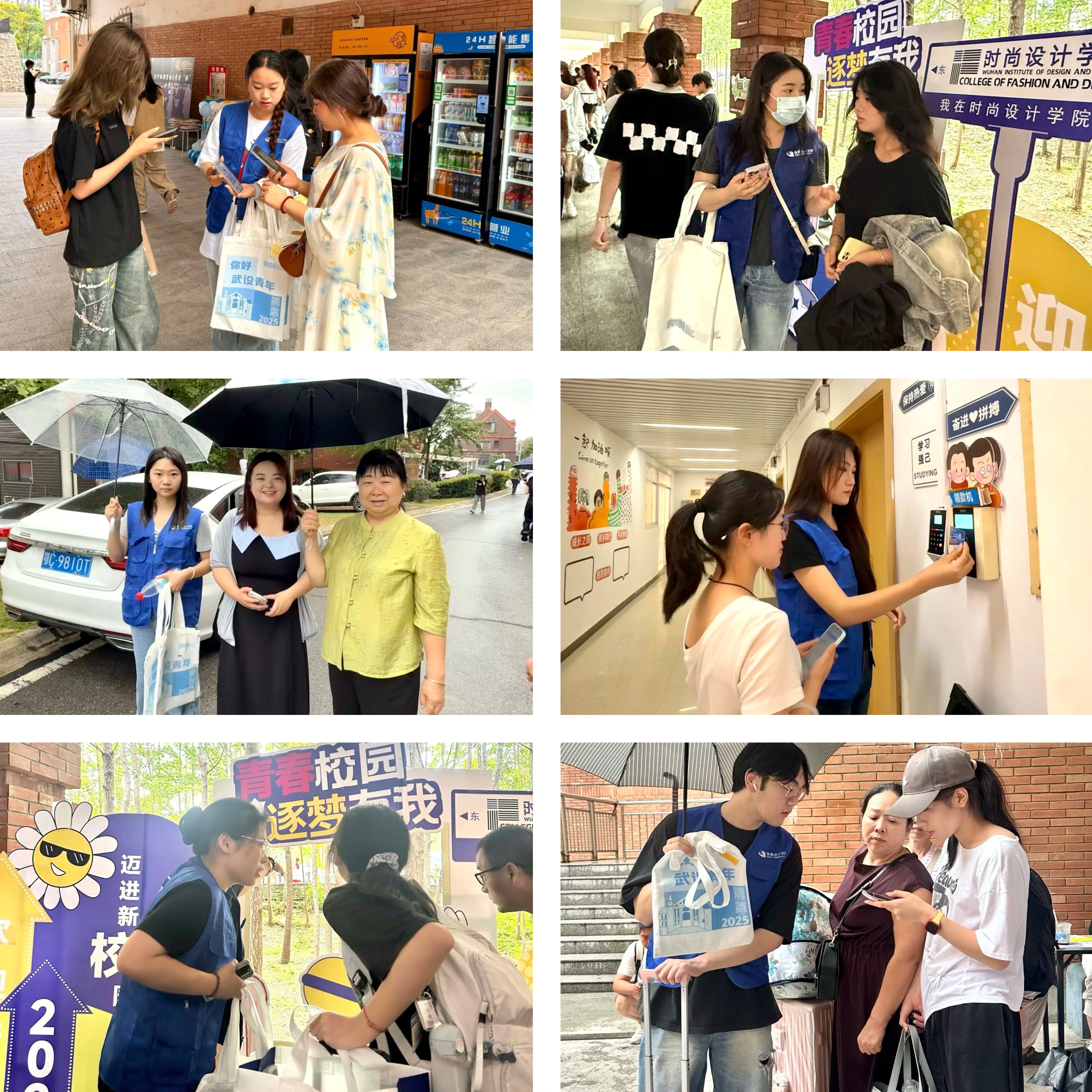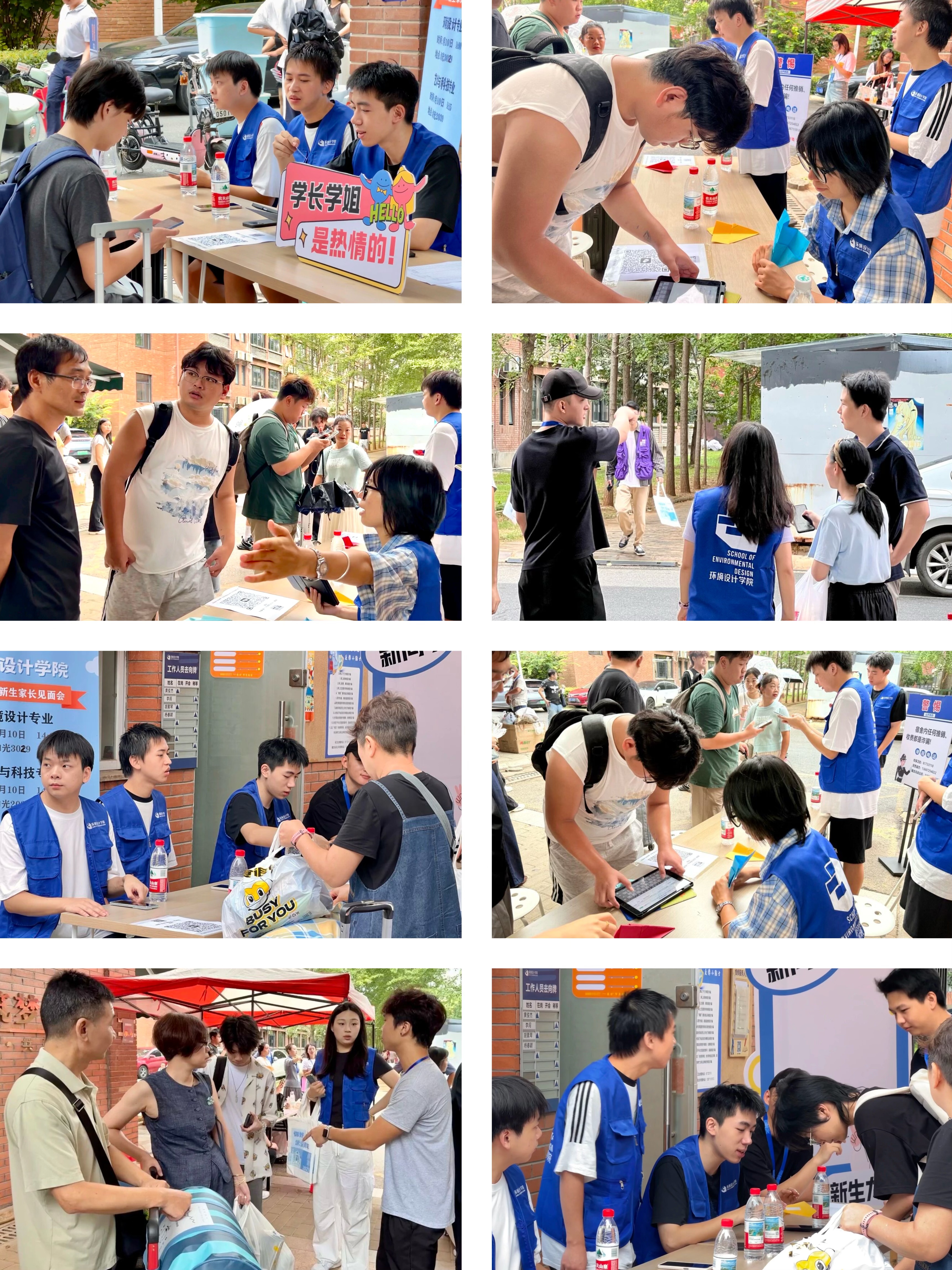 志愿者们身着统一的蓝色志愿马甲,看到拎着行李的新生便主动上前帮忙,从资料逐页核对、校园一卡通激活操作,到带领新生找到宿舍、介绍周边设施,全程贴心陪伴。他们的热情笑容与细致服务,渐渐驱散了新生初来乍到的陌生感,也让同行家长倍感安心,真切感受到“环设大家庭”的温暖。