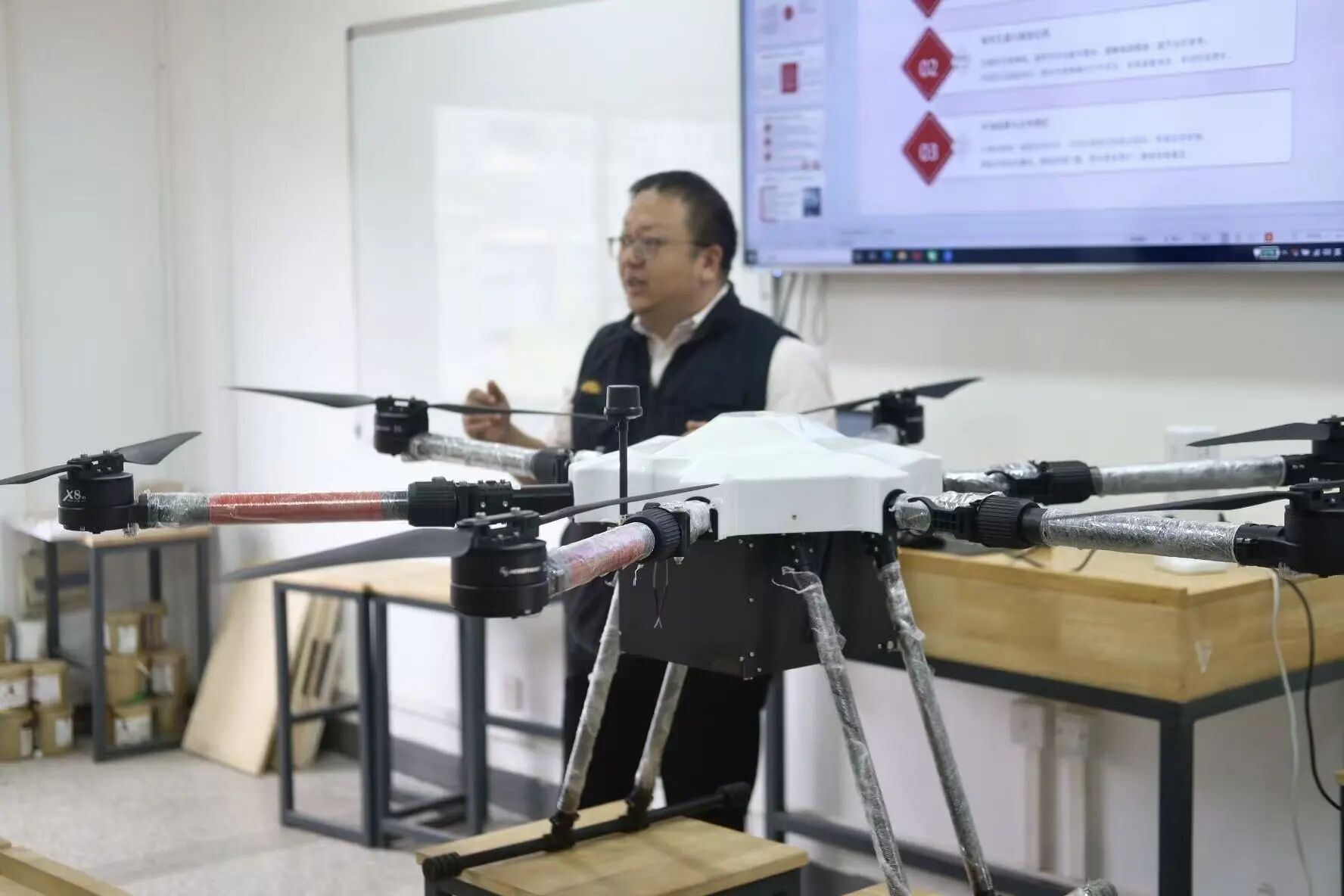 下午的课程聚焦农业植保核心,大疆T100植保机成为全场焦点。导师们围绕植保作业原理、药剂装载规范、飞行高度控制等关键知识点系统讲解,将理论与实际作业场景紧密结合,让同学们清晰掌握植保无人机的应用逻辑。