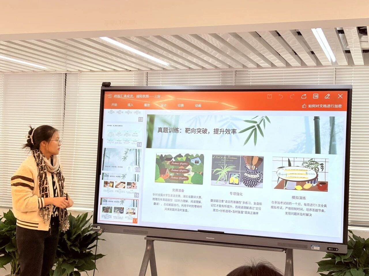 之后,方姝雅同学分享了应对挑战的方法:设计思维陷入困境时,可通过学习优秀案例、拓宽视野、交流探讨来激发灵感;软件操作难题可借助线上资源+请教他人高效解决;英语学习需日积月累,可通过背单词、精进语法、提升听说能力、进行刷题训练、参与相关活动以及开展专业英文阅读,全方位提升应用能力。