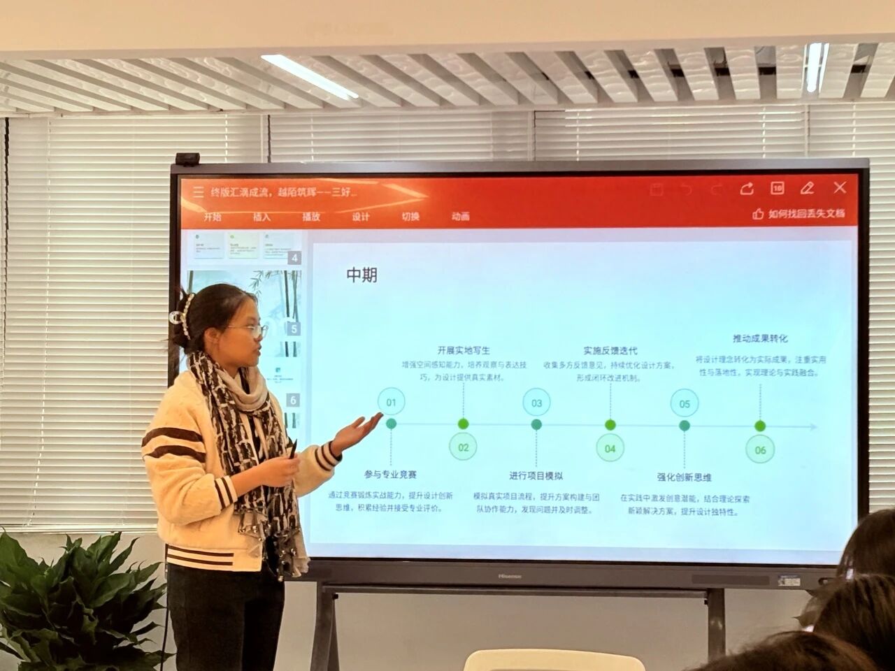 在分享会上,方姝雅同学提出大学成长首要秘诀是制定清晰的分阶段目标。短期聚焦学业根基,掌握专业知识、取得优异成绩,提前接触CAD等软件并实践,为后续发展打下基础;中期投身实践,参与学科竞赛、实地写生等活动积累经验,参与项目规划与设计,锤炼创新思维,推动知识转化为成果;长期锚定职业方向,融合专业技能与设计理念,打磨项目实践能力,实现自我能力提升。