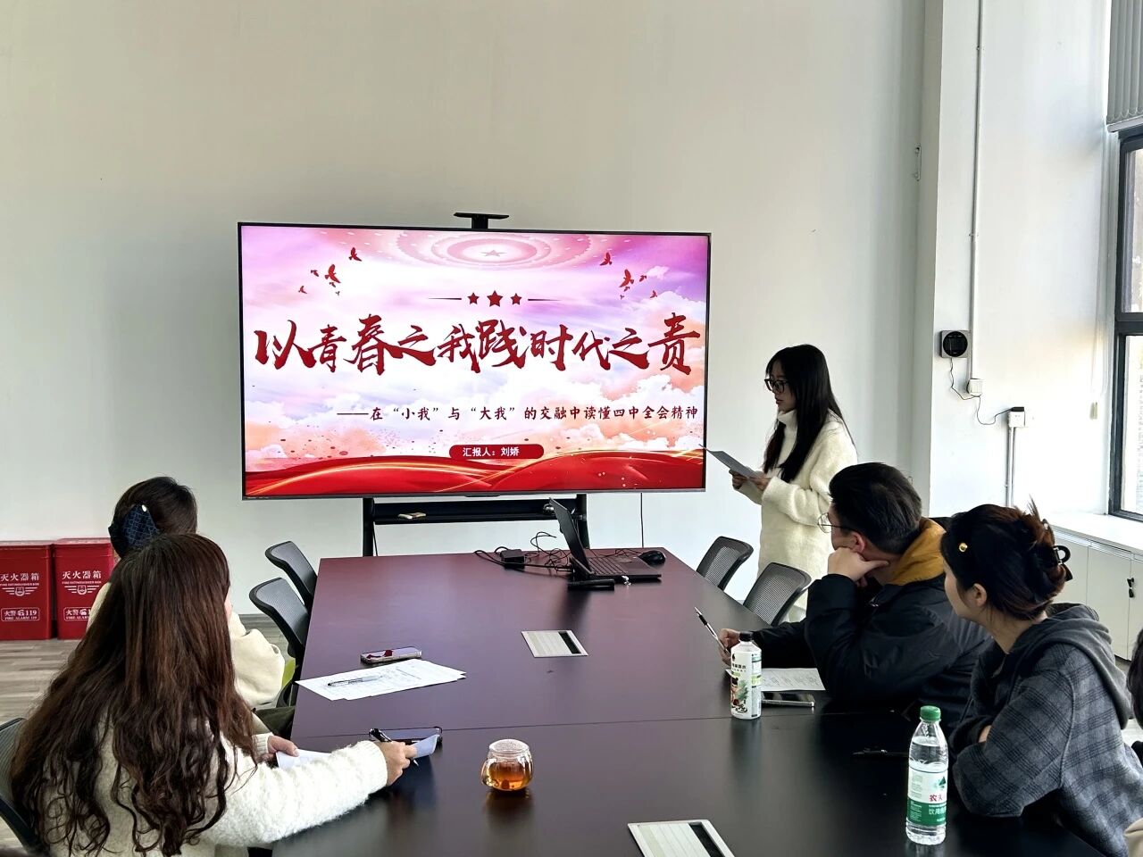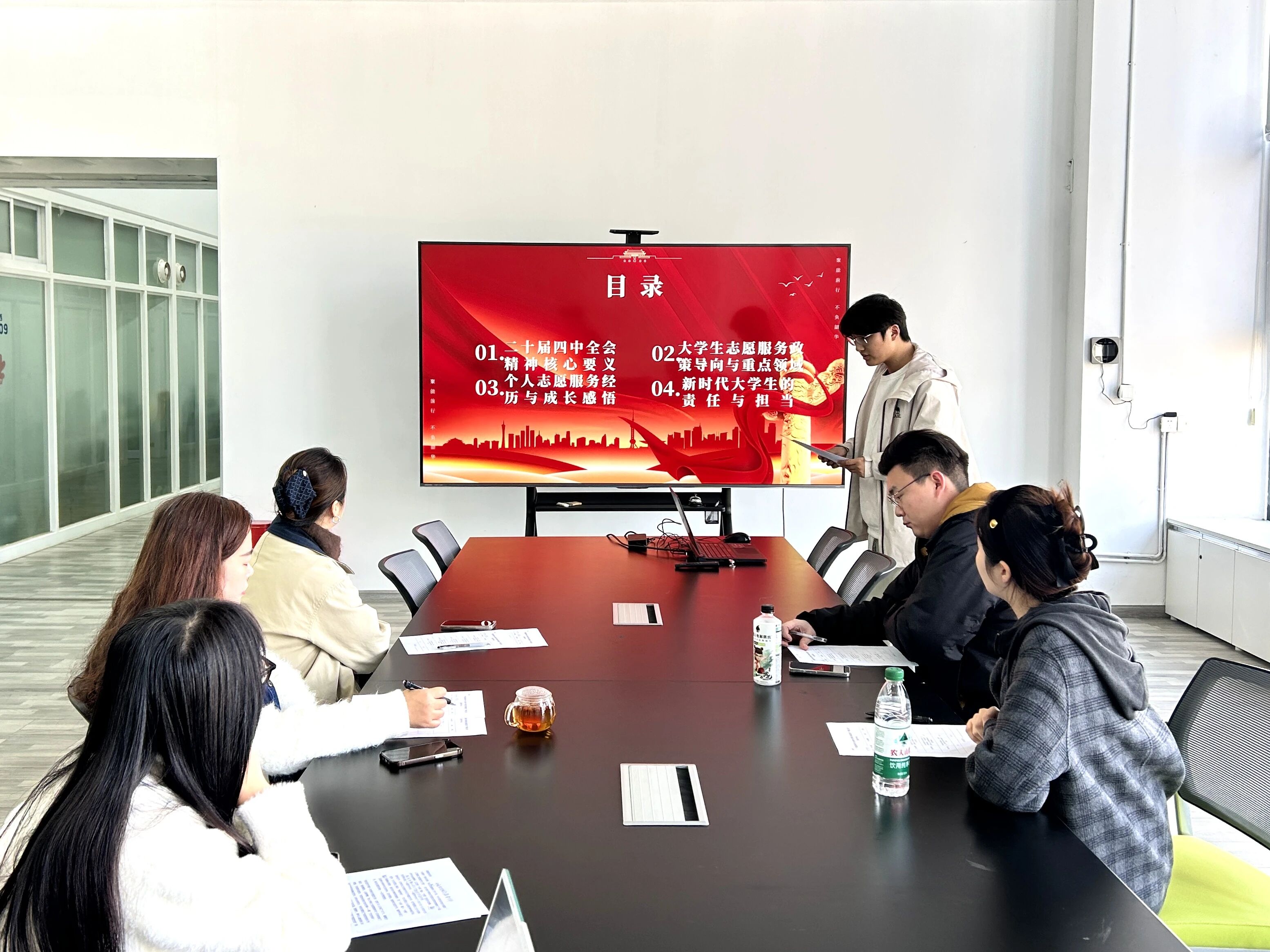 本次比赛旨在选拔优秀宣讲人才,鼓励员工围绕四中全会核心要义,结合专业特色与青年视角进行创新阐释。初赛中,四位由公司党支部推荐的员工预备党员依次登台,展现了理论学习和专业思考的深度结合:周建坤同学以《黔东南传统建筑文化传承与乡村振兴的青年实践》为题,探讨文化遗产保护与乡村振兴的青春路径;许皓同学在《以志愿微光映时代征程》中,结合志愿服务经历,诠释青年责任与时代使命;刘娇(同学通过《以青春之我践时代之责》,讲述如何在“小我”与“大我”的交融中践行全会精神;张真俊同学立足专业,分享《从“有居”到“优居”:环境设计服务于人民对美好生活的向往路径探索》。选手们借助PPT、案例叙述等形式,将宏观政策与设计实践、个人成长与社会发展紧密联系,展现了环境设计学子扎根现实、胸怀家国的理论素养与青春担当。