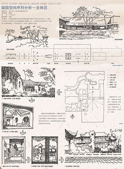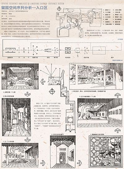 空间序列组织是关系到园的总体结构布局的全局性问题,具有多空间、多视点和连接性变化等特点。园林是实实在在的空间艺术,不单考虑某些固定点的景观效果,且考虑到人在行进过程中由空间变化带来的不同感受。该作品以游人行进的方向为序,对留园空间序列进行分析,从中学习空间组织的手法。