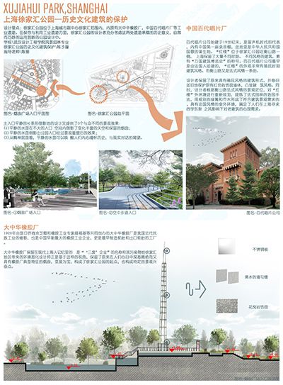徐家汇公园位于上海城市副中心,内原有大中华橡胶厂,中国百代唱片厂等工业遗迹,徐家汇公园的设计者充分考虑这两处遗迹承载的历史意义,在设计中巧妙地让使用者感受到历史与现代的对话。该作品研究了场地中历史建筑的保护情况,并从中学习工业遗址的处理手法。