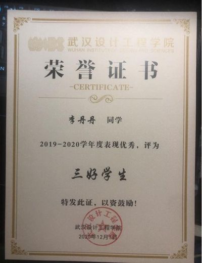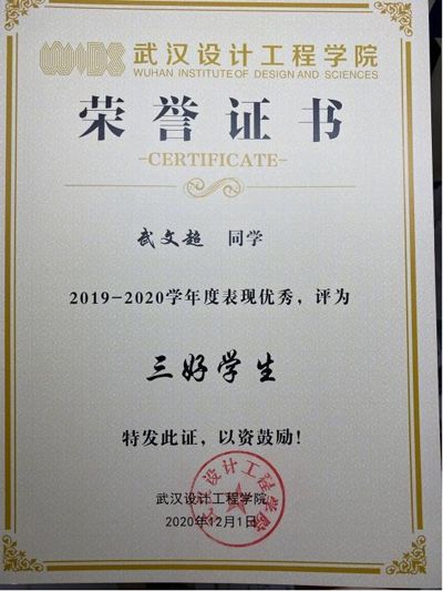 2019-2020学年度武文超同学获“三好员工”荣誉称号。