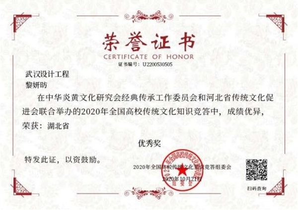 2019年黎妍昉同学获“全国高校传统知识文化竞答”优秀奖。