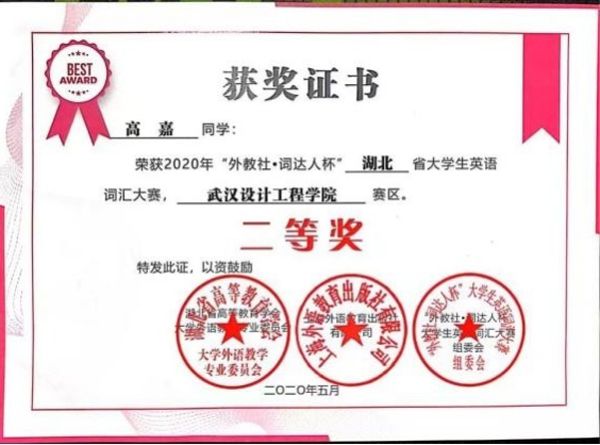 2020年高嘉同学获“外教社·词达人杯”校赛区二等奖。