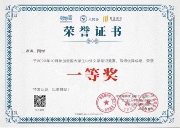 2020年高嘉同学获“全国大学中外文学常识”一等奖。