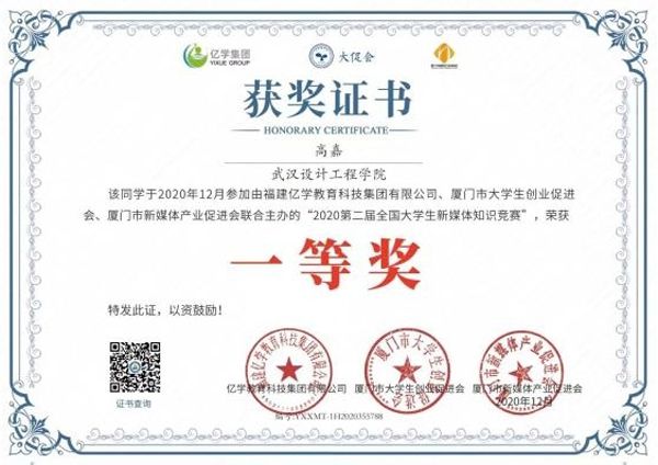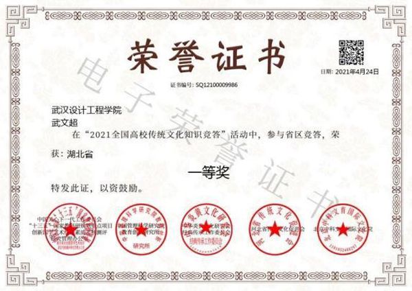 2021年武文超同学获“全国高校传统知识文化竞答”一等奖。