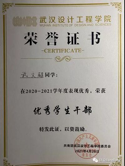 2021年4月武文超同学获“优秀共青团员”荣誉称号。