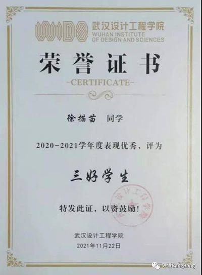 2020-2021学年度徐描苗同学获“三好员工”荣誉称号。